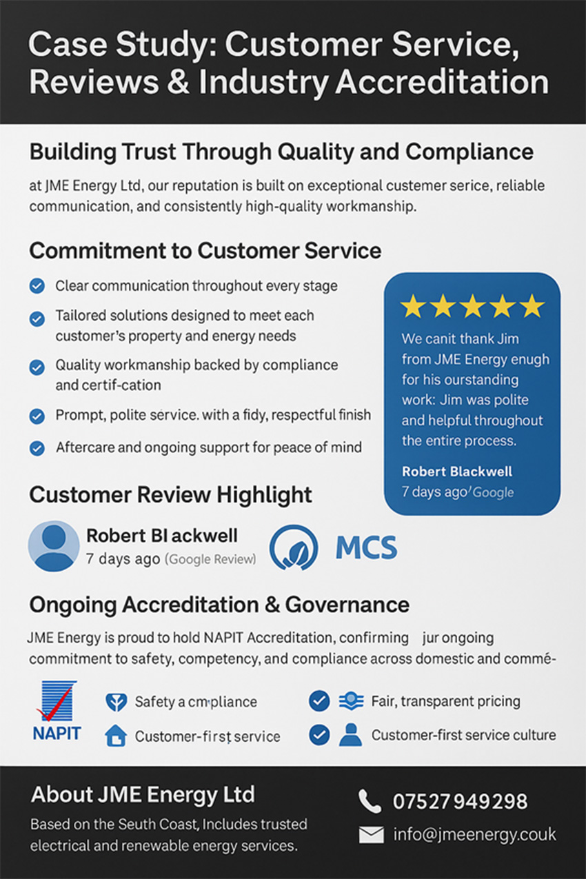 At JME Energy Ltd, our reputation is built on exceptional customer service, reliable communication, and consistently high–quality workmanship. As we continue to grow, we’re proud to be audited for MCS certification and to be joining the HIES consumer code – further strengthening our position as a trusted, accredited installer for electrical and renewable technologies.
